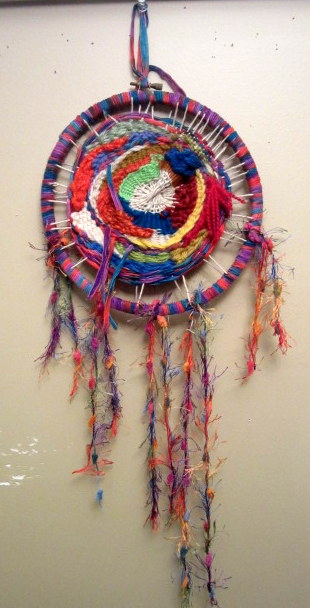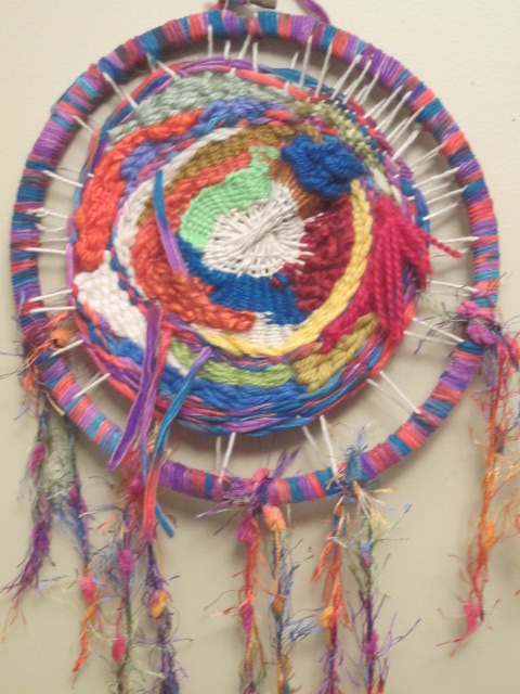 Designed and woven by Gun-Marie Nalsen 2014 Tapestry woven on a wooden hoop Wool, silk and cotton threads on a linen warp 7.5″ dia. $ 40