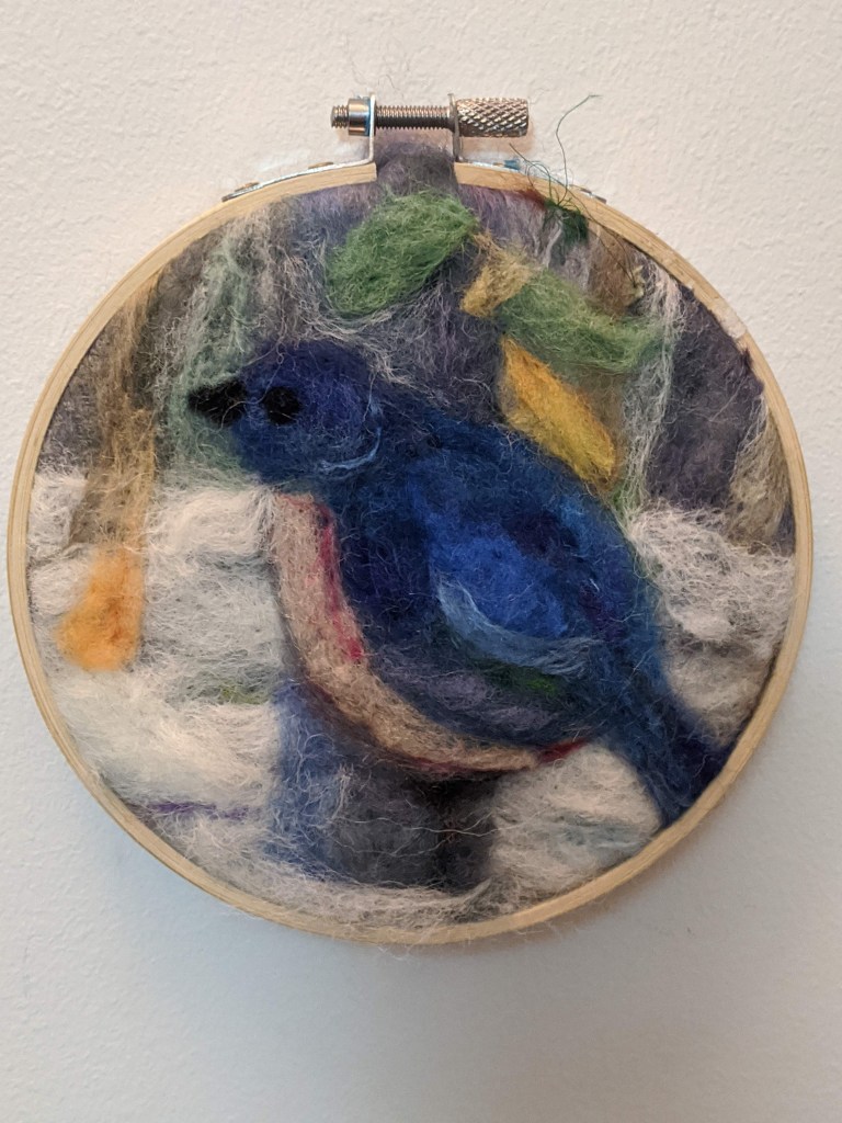 This bird is flying to better weather in May! It was fun to felt some snow, my first experience, not bad really! Also a piece for the exhibition in Madrid next May!