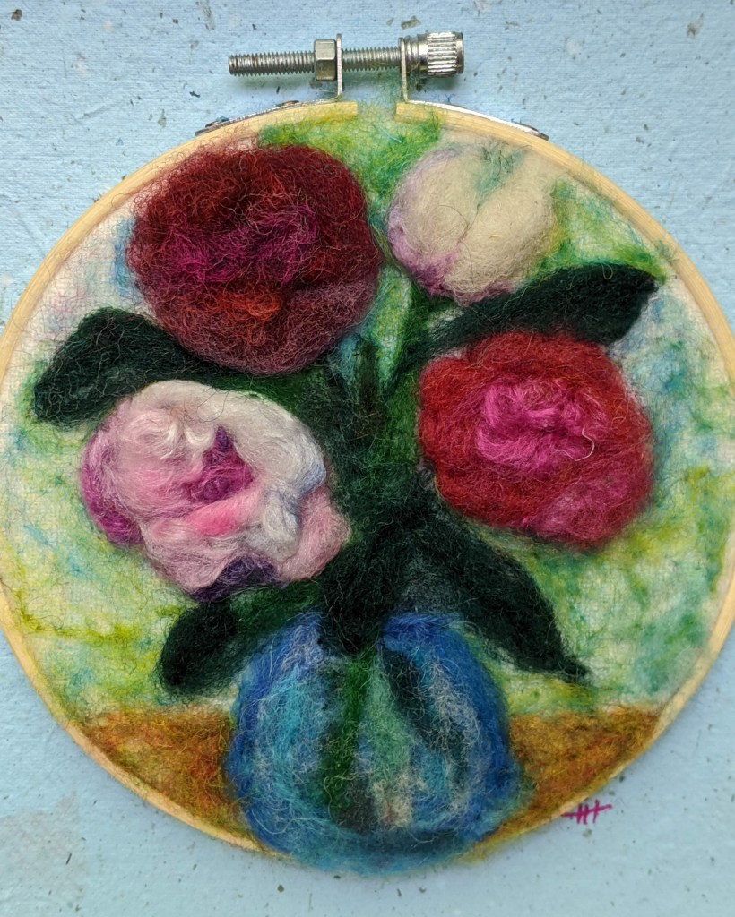 This is a #kdmstudio30daychallenge that I did. It was fun because each day I had to make something about the day. So one day I made bread, the other I found lilies, another I was sleepy, and so on. I used markers to paint some of it, rug hooking, needle felting. The difficult part was to put everything together, as I had started randomly. But it worked, one part is me and my heart and food and the rest is our house with flowers and a waterfall and rain. You have to imagine all!
