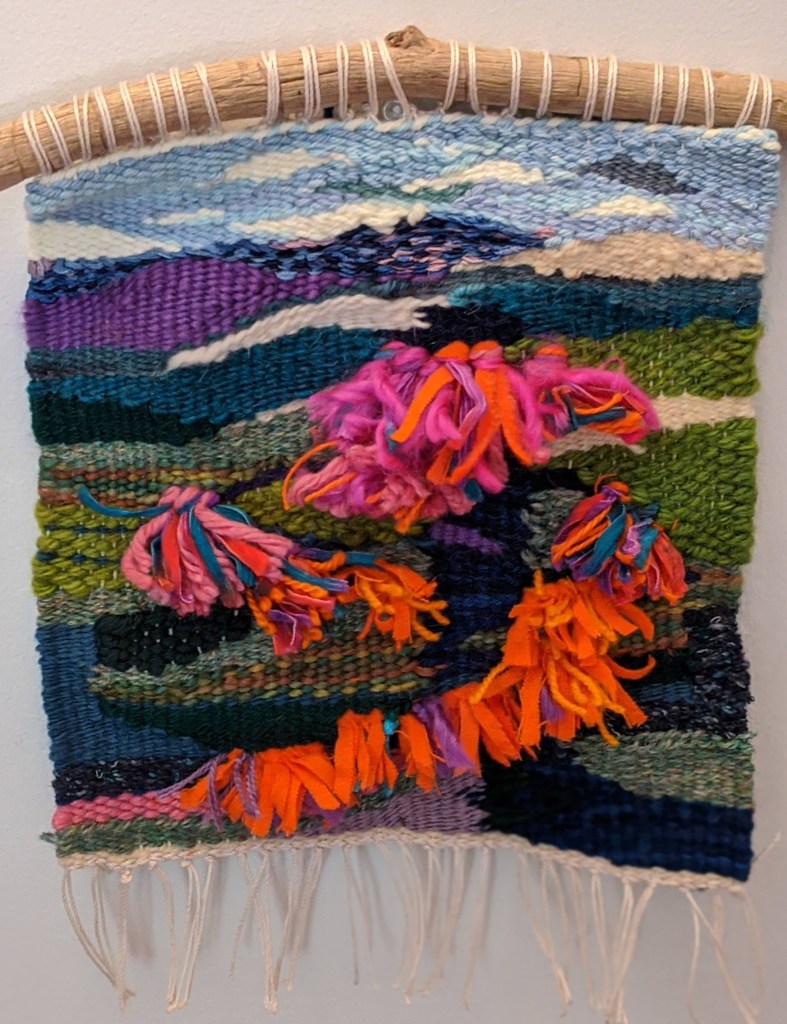 It was fun to make this piece, I started not knowing what I was going to weave, which happens almost every time I start a small tapestry. Suddenly a tree and flowers appeared, the mountains in the back got natural as I worked.