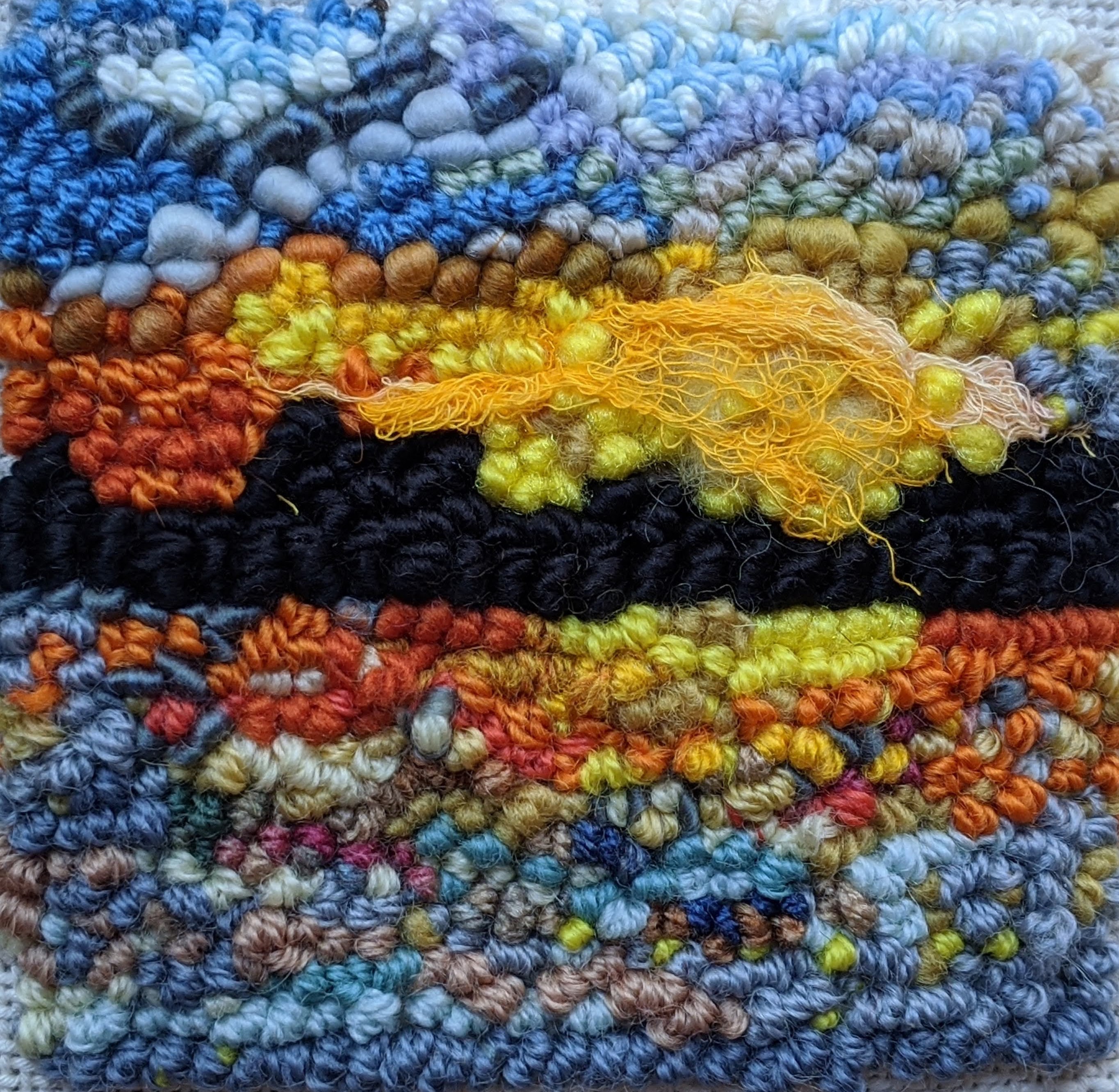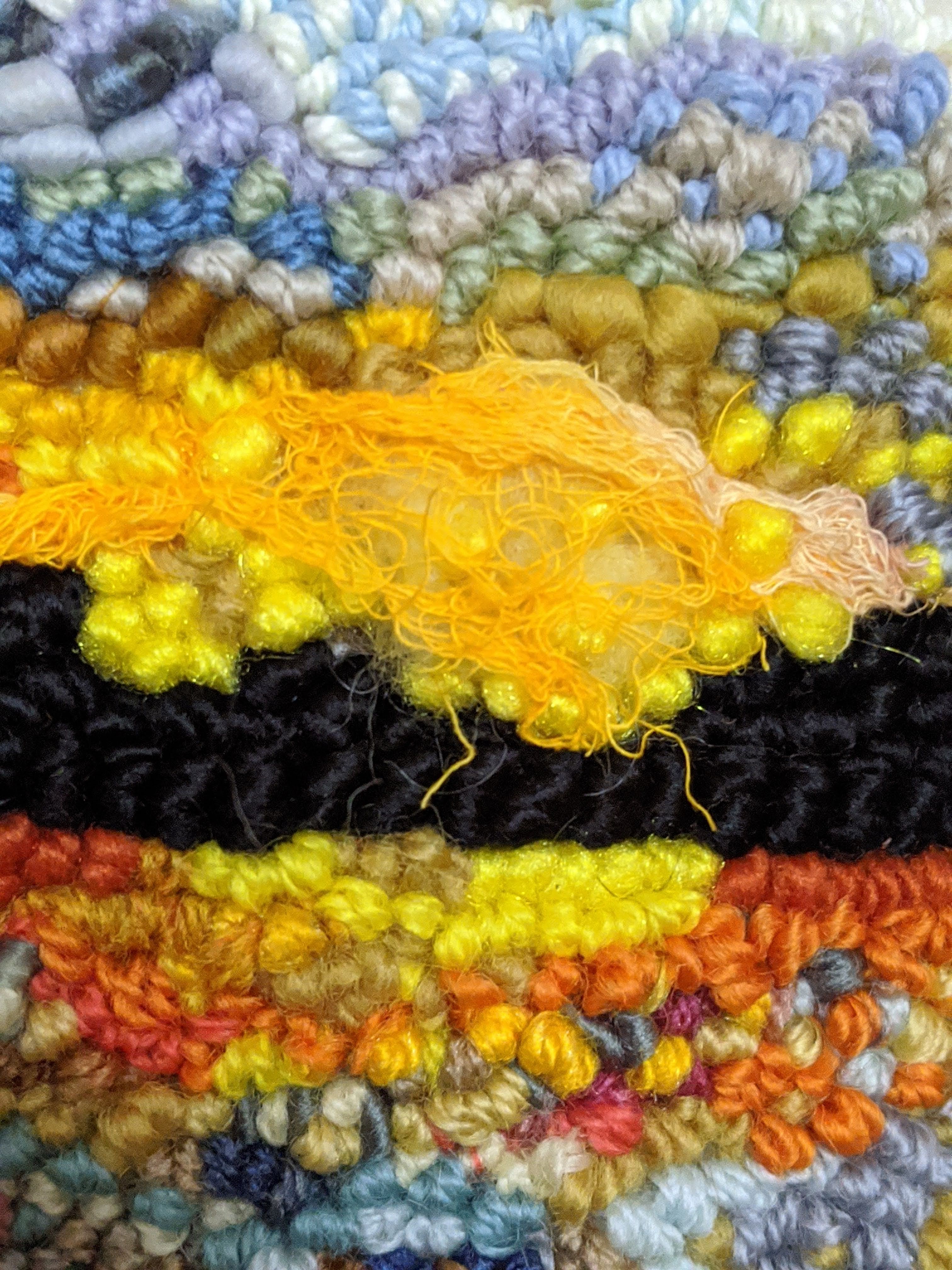 This was my first experience to hook with yarn, and achieved some of the Pointillism. It is a quite different experience to hook with yarn than with wool fabric. The effect is completely different! I liked it! The only place that I used another material was on the sun, I though the effect of the cheese cloth is good! Thanks you Karen Miller for teaching me this!