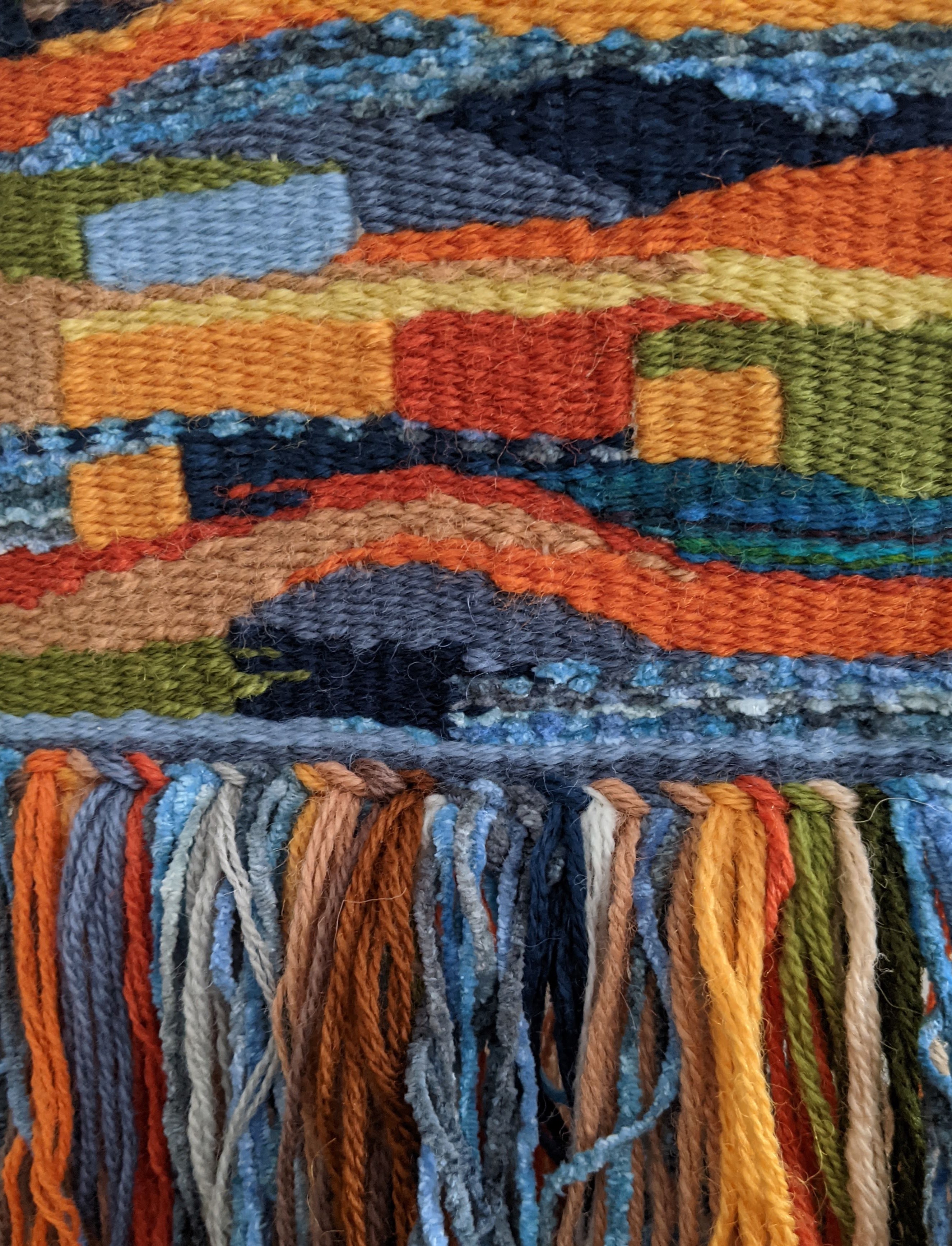 When I started weaving it I had no fixed idea of any design, only I had a bunch of yarn in different beautiful colors. So I started without any idea, and when it was finished, I realised that it looked like a small town, in the middle of nowhere, with small houses and streets in the middle. It is like a miracle in a way! That is why it is called Pueblo! It was so much fun to move my hands weaving, it is like a meditation.