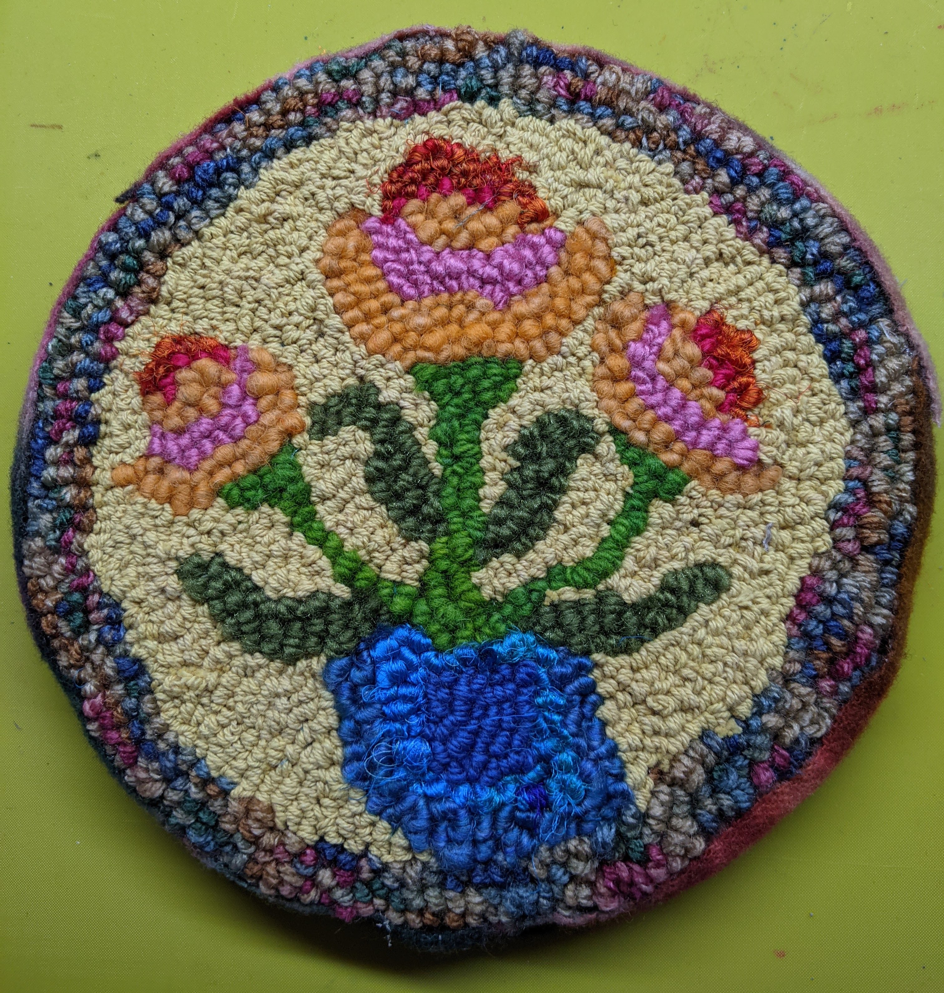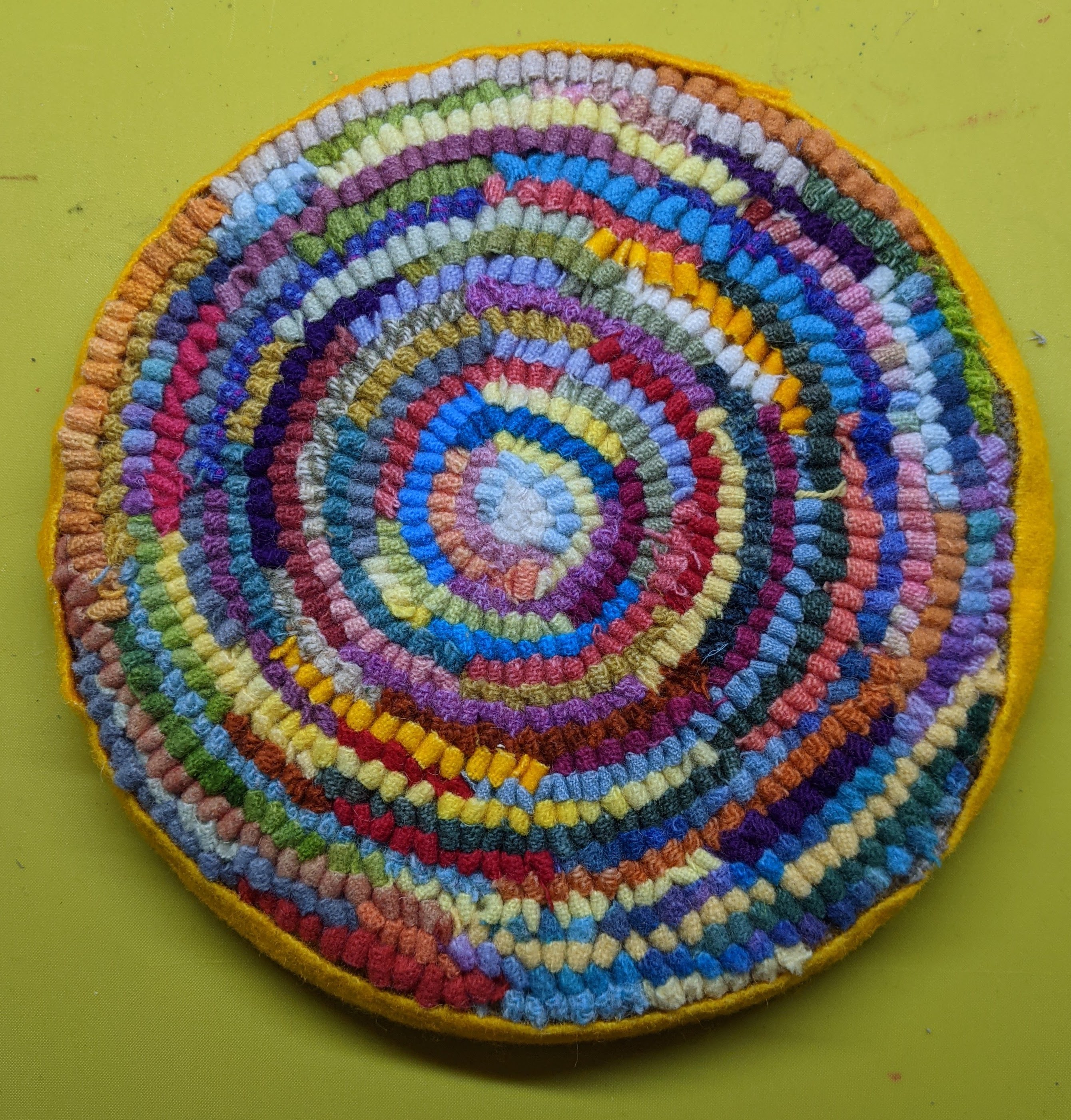 Hand dyed wool fabric strips and hand dyed wool yarn on linen