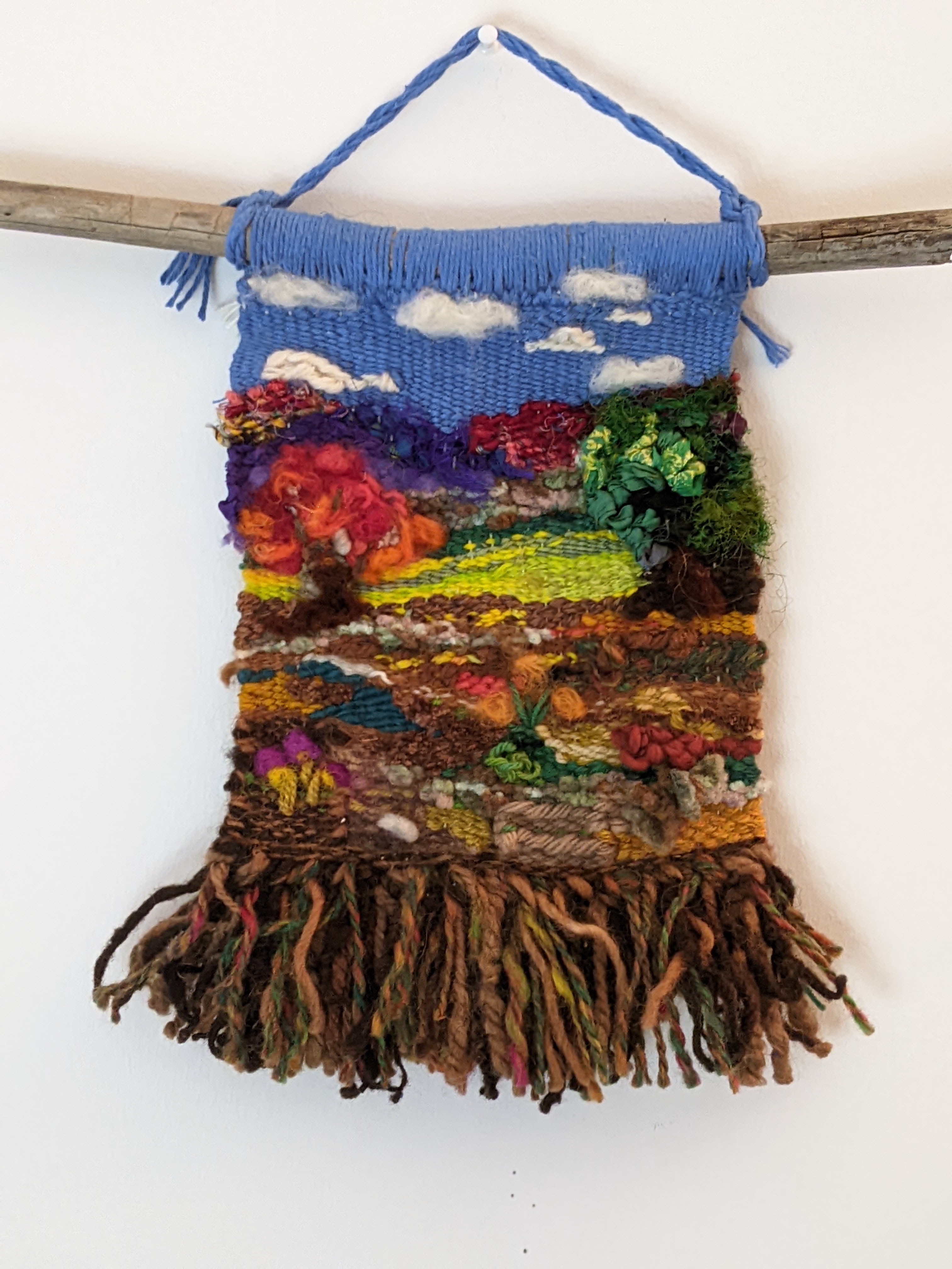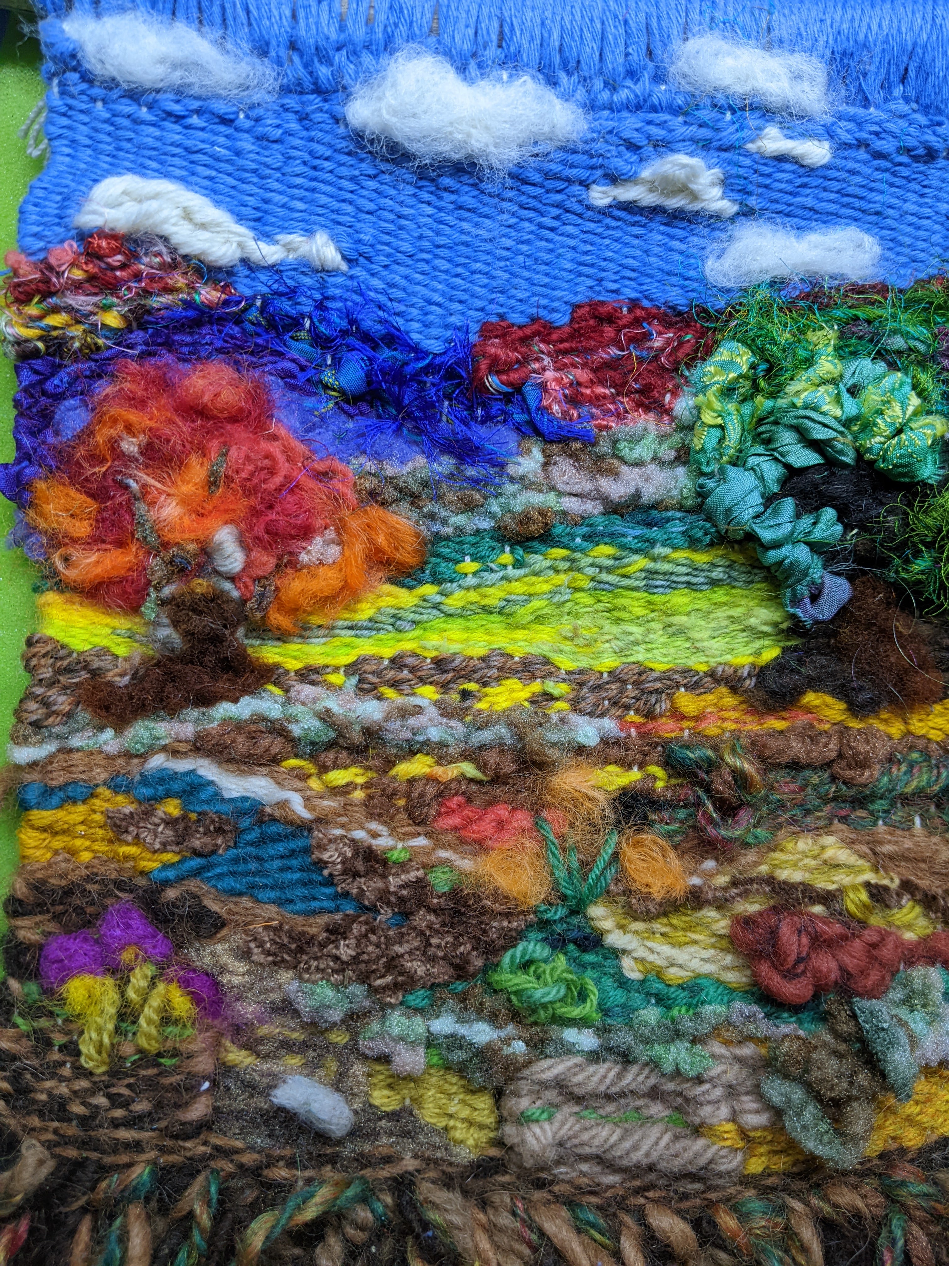 Wool yarn, hand dyed wool yarn, sari silk, hand dyed wool roving on a cotton warp