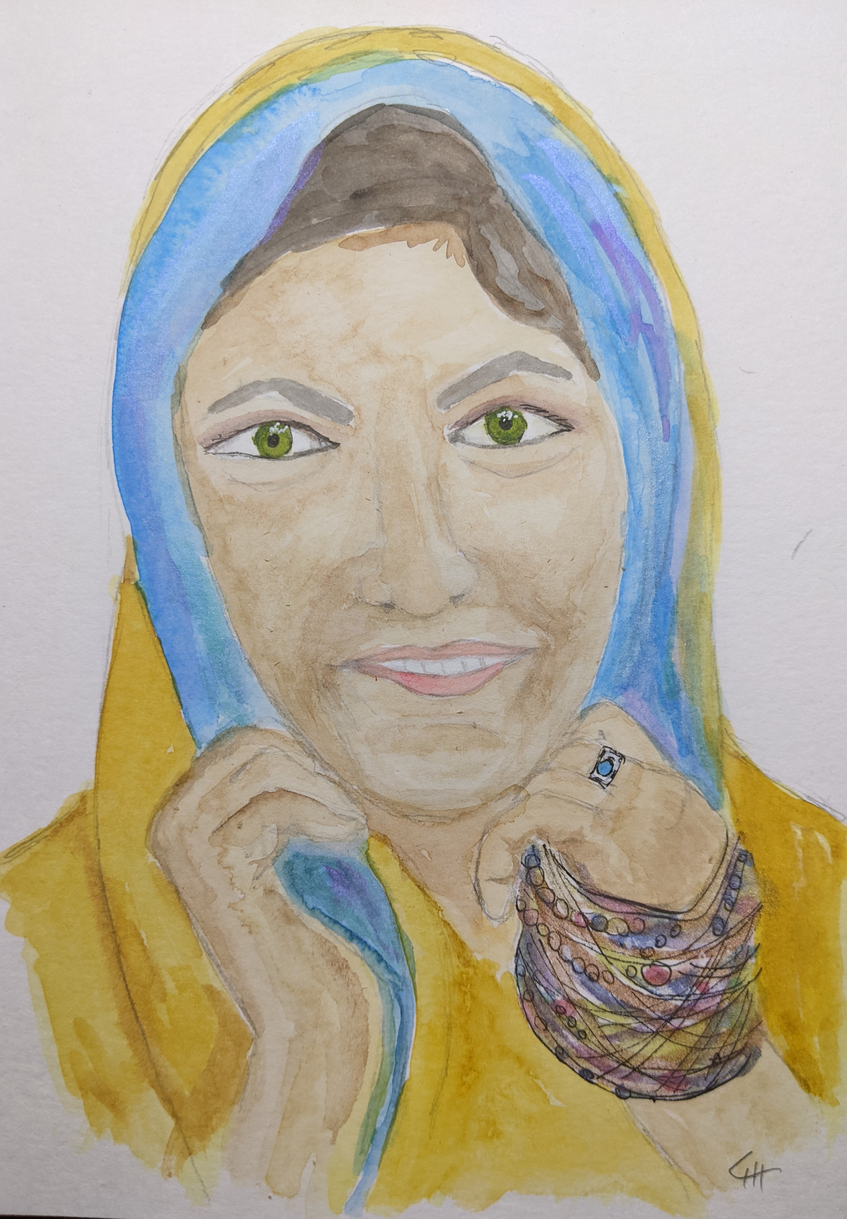 the lady painting. She has a long dress, the furniture is very comfortable , good colors and a white