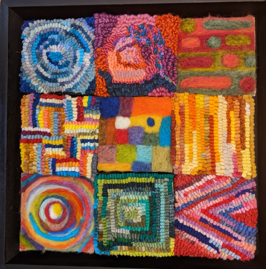 This piece started as small rug hooked and felted pieces, but I decided to mount each one on a